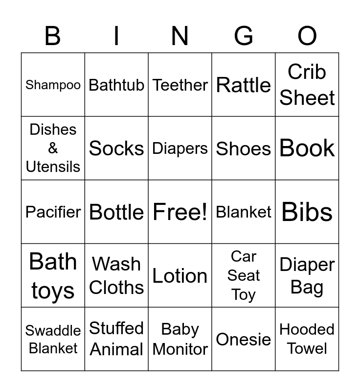 This bingo card has a free space and 24 words: Wash Cloths, Stuffed Animal, Diapers, Swaddle Blanket, Crib Sheet, Shampoo, Dishes & Utensils, Bathtub, Blanket, Lotion, Shoes, Pacifier, Car Seat Toy, Diaper Bag, Socks, Onesie, Bibs, Teether, Book, Bottle, Hooded Towel, Bath toys, Rattle and Baby Monitor.