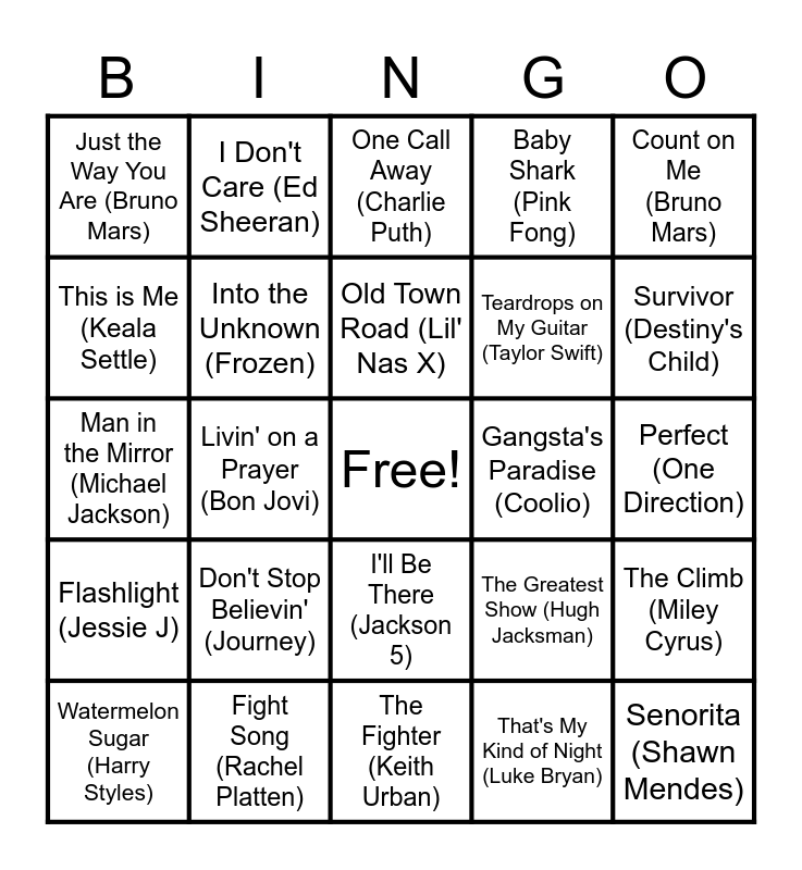 This bingo card has a free space and 43 words: Bye Bye Bye (Nsync), Senorita (Shawn Mendes), South of the Border (Ed Sheeran), Watermelon Sugar (Harry Styles), This Is How We Do It (Montell Jordan), That's My Kind of Night (Luke Bryan), One Call Away (Charlie Puth), How Far I'll Go (Auli'i Cravalho), Count on Me (Bruno Mars), Fight Song (Rachel Platten), Baby Shark (Pink Fong), Gangsta's Paradise (Coolio), I'll Be There (Jackson 5), Don't Stop Believin' (Journey), Die a Happy Man (Thomas Rhett), The Fighter (Keith Urban), The Middle (Zedd), Man in the Mirror (Michael Jackson), The Champion (Carrie Underwood), Survivor (Destiny's Child), I Don't Care (Ed Sheeran), Locked Away (Adam Lang), Shake It Off (Taylor Swift), Just the Way You Are (Bruno Mars), Eye of the Tiger (Survivor), Perfect (One Direction), Sit Still, Look Pretty (Daya), Rise Up (Andra Day), The Greatest Show (Hugh Jacksman), Flashlight (Jessie J), Sweet Caroline (Neil Diamond), The Climb (Miley Cyrus), It's Tricky (Run DMC), Livin' on a Prayer (Bon Jovi), When I was Your Man (Bruno Mars), A Thousand Years (Christina Perri), Little Eistein (Trip Ship Ent), Old Town Road (Lil' Nas X), This is Me (Keala Settle), Teardrops on My Guitar (Taylor Swift), Locked Away (R. City), Into the Unknown (Frozen) and Let It Go (Frozen).