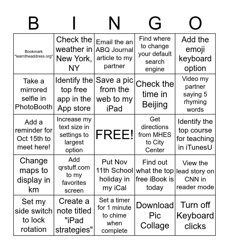 This bingo card has a free space and 24 words: Add qrstuff.com to my favorites screen, Create a note titled "iPad strategies", Save a pic from the web to my iPad, Set my side switch to lock rotation, Add the emoji keyboard option, Bookmark "learntheaddress.org", Take a mirrored selfie in PhotoBooth, Check the weather in New York, NY, Get directions from MHES to City Center, Put Nov 11th School holiday in my iCal, Check the time in Beijing, Add a reminder for Oct 15th to meet here!, Find out what the top free iBook is today, View the lead story on CNN in reader mode, Identify the top free app in the App store, Download Pic Collage, Identify the top course for teaching in iTunesU, Email the an ABQ Journal article to my partner, Video my partner saying 5 rhyming words, Increase my text size in settings to largest option, Turn off Keyboard clicks, Change maps to display in km, Find where to change your default search engine and Set a timer for 1 minute to chime when complete.