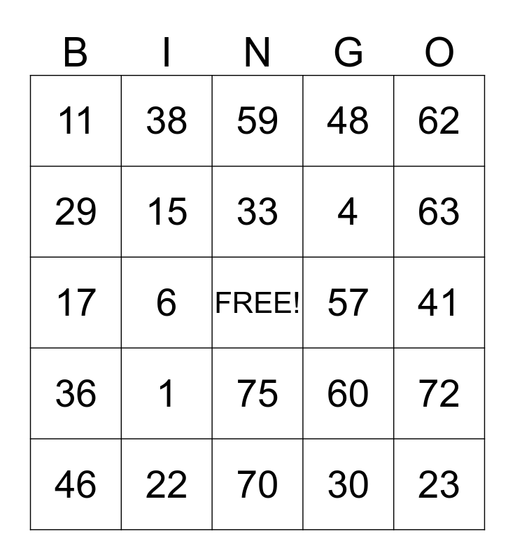 This bingo card has a free space and 24 words: 1, 22, 33, 46, 62, 11, 29, 38, 57, 75, 4, 17, 60, 72, 15, 30, 41, 59, 63, 6, 23, 36, 48 and 70.