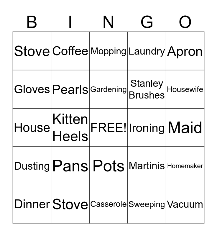 This bingo card has a free space and 45 words: Toaster, Vacuum, Dishes, Dinner, Diapers, Sweeping, Mopping, Cooking, Apron, Stove, Laundry, Ironing, Pots, Pans, Blender, Casserole, Baking, House, Cleaning, Housewife, Coffee, Carpool, Groceries, Stove, Nurse, Maid, Housekeeper, Wine, Martinis, Dusting, Sewing, Homemaker, Curlers, Lipstick, Perfume, Kitten Heels, Panty Hose, Cigarettes, Hoover, Gardening, Gloves, Stanley Brushes, Watkins Spices, Pearls and Clothesline.