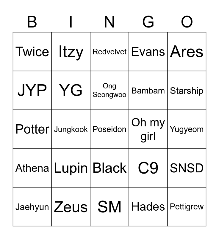 This bingo card has 25 words: Athena, Zeus, Poseidon, Hades, Ares, Twice, Itzy, Redvelvet, Oh my girl, SNSD, JYP, YG, SM, C9, Starship, Jaehyun, Jungkook, Ong Seongwoo, Bambam, Yugyeom, Potter, Lupin, Black, Evans and Pettigrew.