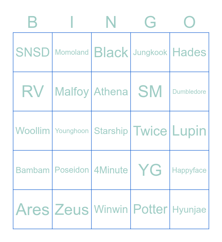 This bingo card has a free space and 24 words: Poseidon, Zeus, Athena, Ares, Hades, SNSD, RV, Momoland, Twice, 4Minute, SM, Woollim, YG, Happyface, Malfoy, Potter, Lupin, Black, Dumbledore, Younghoon, Hyunjae, Bambam, Jungkook and Winwin.