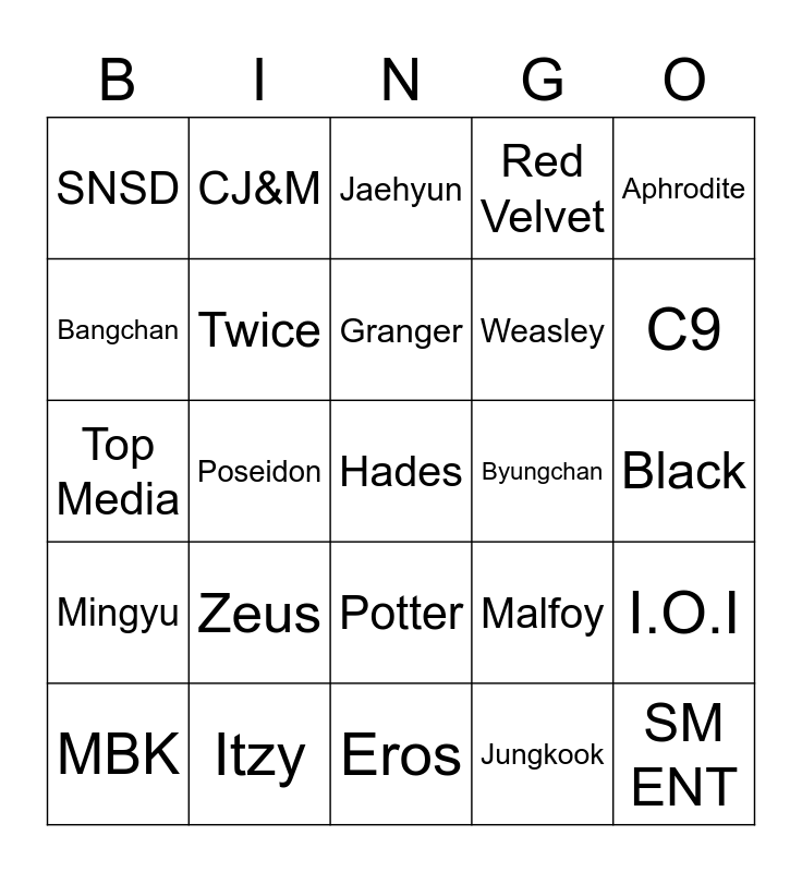 This bingo card has a free space and 24 words: Zeus, Itzy, Granger, MBK, Aphrodite, SNSD, Bangchan, CJ&M, Byungchan, Potter, Weasley, Top Media, Malfoy, I.O.I, Twice, Jungkook, Black, Jaehyun, C9, Poseidon, SM ENT, Mingyu, Red Velvet and Eros.
