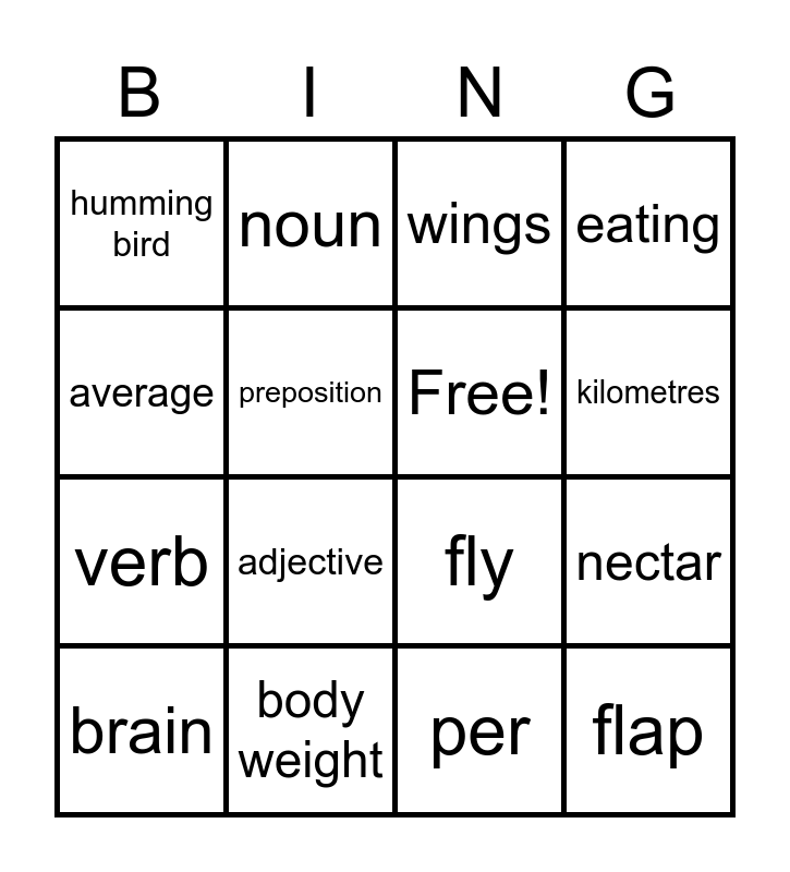 This bingo card has 19 words: fly, dive, wings, flap, nectar, average, per, humming bird, noun, verb, adjective, preposition, Free!, body weight, brain, beaks, eating, kilometres and energy.