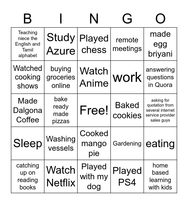 This bingo card has a free space and 34 words: Cooked pasta, Played PS4, Exercise, Brew coffee, Sleep, buying groceries online, made egg briyani, catching up on reading books, Study Azure, Sang karaoke, Watch Anime, Played chess, Cooked creamy chicken, Aiming to learn to make 5 soups, Baked cookies, answering questions in Quora, Watch Netflix, Made Dalgona Coffee, Washing vessels, Gardening, Cooked mango pie, Played Nintendo Switch, Teaching niece the English and Tamil alphabet, asking for quotation from several internet service provider sales guys, Played with my dog, home based learning with kids, remote meetings, enjoying sunset, work, Watched cooking shows, Doing the dishes, bake ready made pizzas, eating and feeding birds.