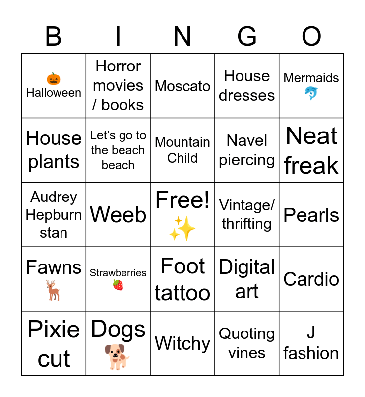 This bingo card has a free space and 24 words: Strawberries 🍓, Dogs 🐕, Mountain Child, Pixie cut, Mermaids🐬, 🎃 Halloween, House plants, Horror movies / books, Vintage/ thrifting, Foot tattoo, Navel piercing, Audrey Hepburn stan, Digital art, Cardio, Let’s go to the beach beach, Quoting vines, Pearls, Moscato, Neat freak, Weeb, J fashion, Fawns 🦌, House dresses and Witchy.