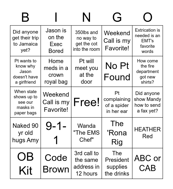 This bingo card has a free space and 29 words: OB Kit, Where's Gayla been lately?, Weekend Call is my Favorite!, Pt asks if he can take one for the road, Did anyone get their trip to Jamaica yet?, 350lbs and no way to get the cot into the room, Home meds in a crown royal bag, 9-1-1, Pt complaining of a spider in her ear, Code Brown, Did anyone show Mandy how to send a fax yet?, ABC or CAB, 3rd call to the same address in 12 hours, The President supplies the drinks, How come the fire department got new shirts?, My Dr. Is waiting for me at the hospital, Wanda "The EMS Chef", Naked 90 yr old hugs Amy, Extrication is needed is an EMT's favorite words, When state shows up to see our masks in paper bags, The 'Rona Rig, Hull EMS Rocks, No Pt Found, Pt wants to know why Jason doesn't have a girlfriend, Weekend Call is my Favorite!, Jason is on the Exec Bored, HEATHER Red, Pt will meet you at the door and Combative Pt has worms in her brain.