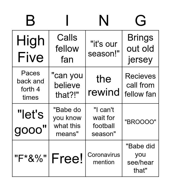 This bingo card has 16 words: Free!, "BROOOO", "it's our season!", High Five, "let's gooo", Calls fellow fan, "I can't wait for football season", Coronavirus mention, Paces back and forth 4 times, "can you believe that?!", "F*&%", Brings out old jersey, "Babe do you know what this means", Recieves call from fellow fan, the rewind and "Babe did you see/hear that".