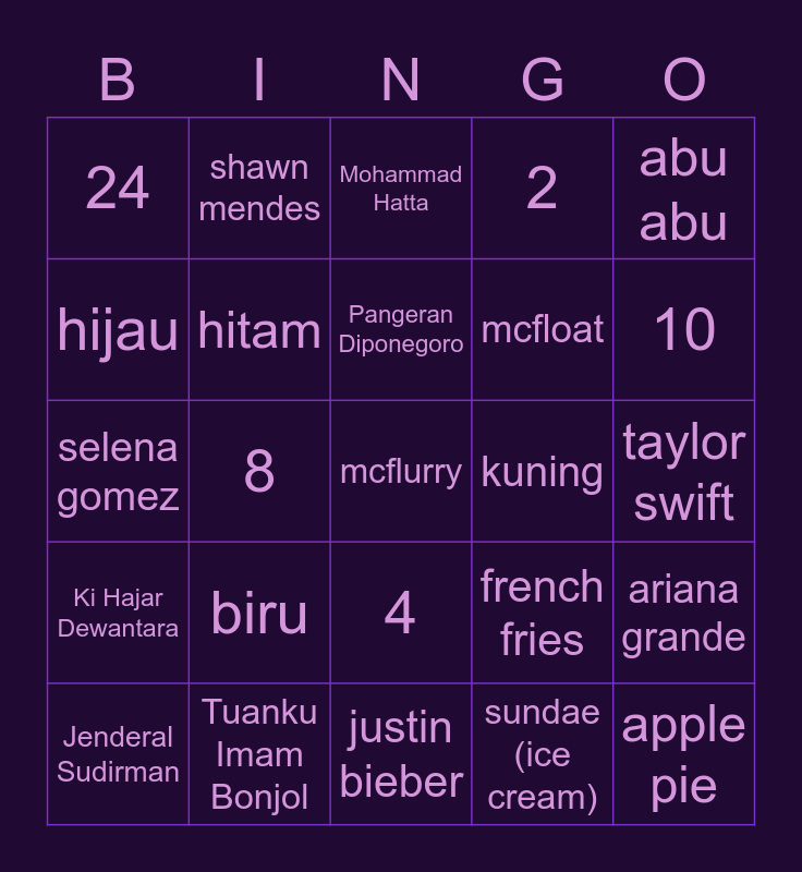 This bingo card has 25 words: biru, justin bieber, Pangeran Diponegoro, Jenderal Sudirman, abu abu, 24, hijau, shawn mendes, kuning, 4, mcfloat, selena gomez, french fries, ariana grande, hitam, apple pie, taylor swift, Mohammad Hatta, 10, 8, mcflurry, Tuanku Imam Bonjol, Ki Hajar Dewantara, 2 and sundae (ice cream).
