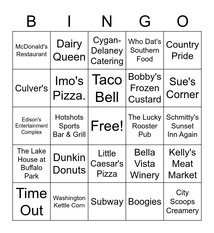 This bingo card has a free space and 28 words: Kelly's Meat Market, Alfonzo's Pizzeria., Bobby's Frozen Custard, Boogies, Culver's, Cygan-Delaney Catering, Dairy Queen, The Lake House at Buffalo Park, The Lucky Rooster Pub, Time Out, Edison's Entertainment Complex, Who Dat's Southern Food, Washington Kettle Corn, Subway, Sue's Corner, Joe's Pizza & Pasta, Dunkin Donuts, Imo's Pizza., Taco Bell, Little Caesar's Pizza, McDonald's Restaurant, Red Apple Restaurant, City Scoops Creamery, Hotshots Sports Bar & Grill, Schmitty's Sunset Inn Again, Bella Vista Winery, Country Pride and The Coffee Box.