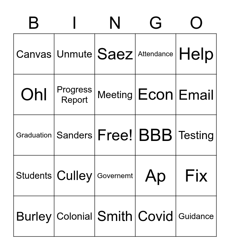 This bingo card has a free space and 24 words: Culley, Colonial, Meeting, Burley, Help, Canvas, Ohl, Unmute, BBB, Governemt, Econ, Graduation, Ap, Fix, Progress Report, Covid, Testing, Saez, Email, Sanders, Guidance, Students, Attendance and Smith.