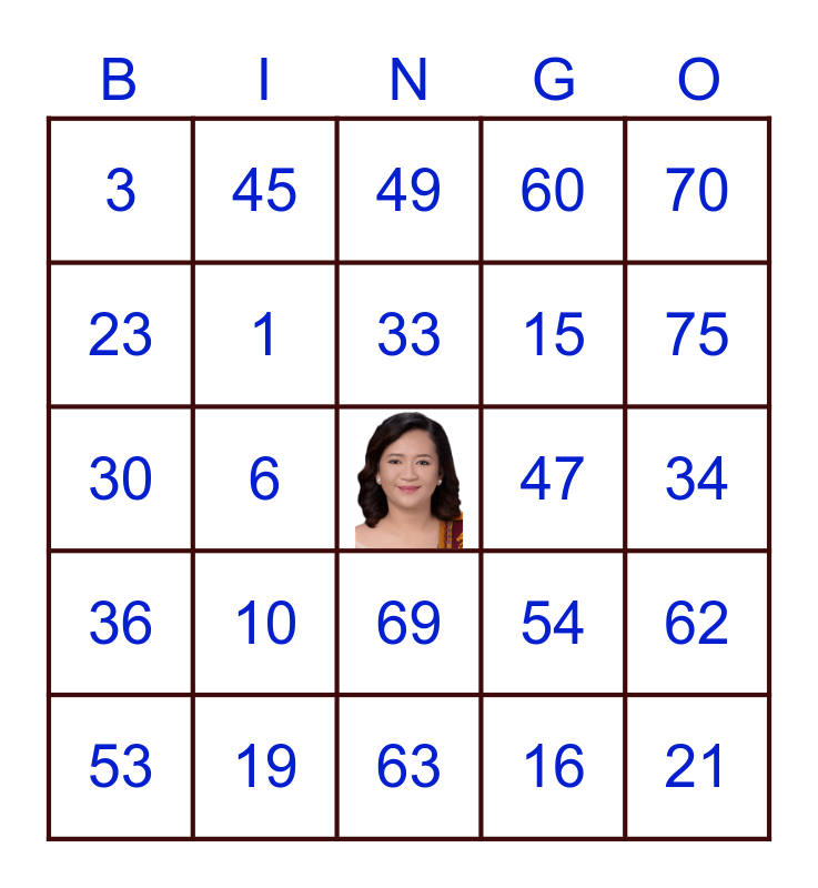 This bingo card has a free space and 24 words: 10, 19, 33, 53, 70, 3, 23, 45, 47, 69, 15, 30, 54, 62, 1, 16, 34, 49, 75, 6, 21, 36, 60 and 63.