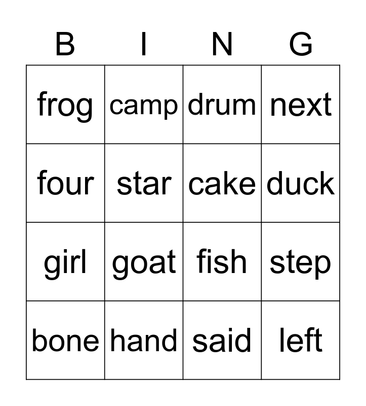 This bingo card has 25 words: Free!, baby, duck, leaf, four, frog, star, camp, hand, lamp, girl, fish, kite, bell, cake, blue, said, drum, goat, step, bone, tree, left, next and stop.