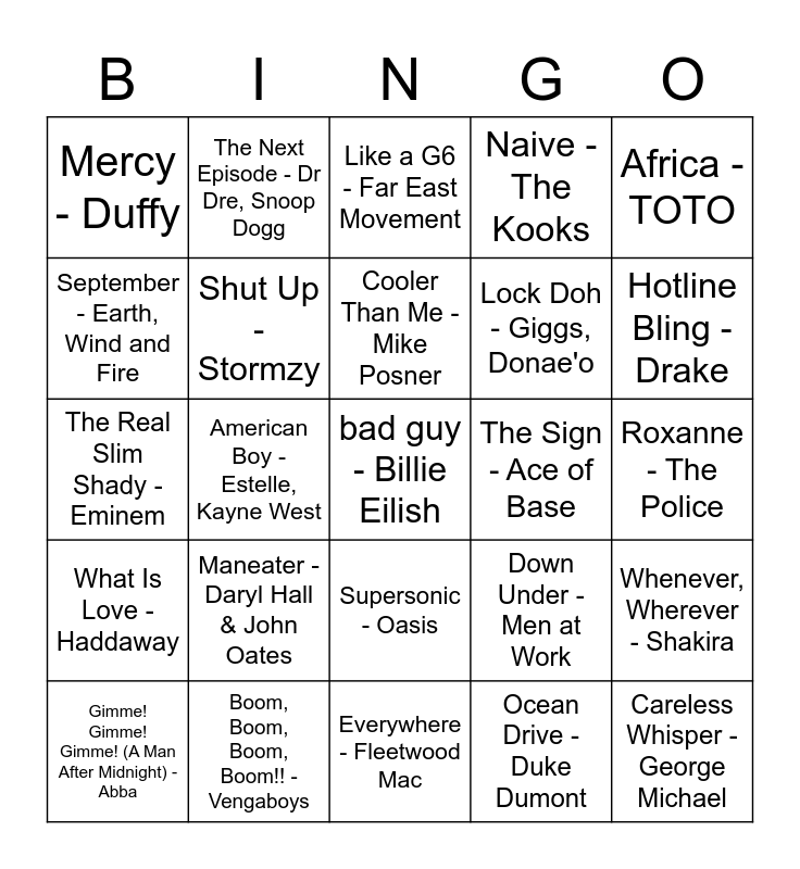 This bingo card has 25 words: Maneater - Daryl Hall & John Oates, Everywhere - Fleetwood Mac, Cooler Than Me - Mike Posner, Gimme! Gimme! Gimme! (A Man After Midnight) - Abba, Africa - TOTO, Mercy - Duffy, September - Earth, Wind and Fire, The Next Episode - Dr Dre, Snoop Dogg, The Sign - Ace of Base, Supersonic - Oasis, Lock Doh - Giggs, Donae'o, The Real Slim Shady - Eminem, Down Under - Men at Work, Whenever, Wherever - Shakira, Shut Up - Stormzy, Careless Whisper - George Michael, Roxanne - The Police, Like a G6 - Far East Movement, Hotline Bling - Drake, American Boy - Estelle, Kayne West, bad guy - Billie Eilish, Boom, Boom, Boom, Boom!! - Vengaboys, What Is Love - Haddaway, Naive - The Kooks and Ocean Drive - Duke Dumont.