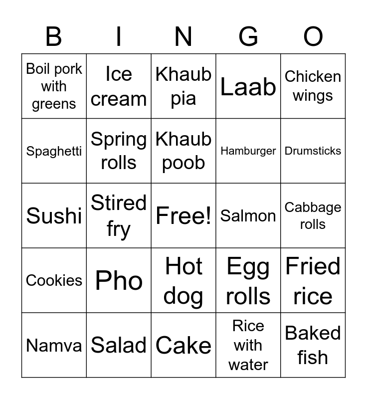 This bingo card has a free space and 24 words: Pho, Salad, Khaub poob, Namva, Chicken wings, Boil pork with greens, Spaghetti, Ice cream, Salmon, Hot dog, Hamburger, Sushi, Egg rolls, Fried rice, Spring rolls, Rice with water, Cabbage rolls, Khaub pia, Drumsticks, Stired fry, Baked fish, Cookies, Laab and Cake.