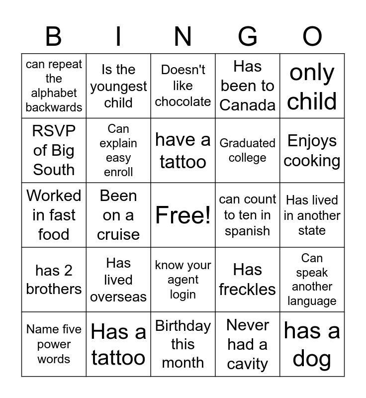 This bingo card has a free space and 39 words: worked at Xfinity for less than 1 year, Know all of the awesome behaviors, Can explain a deposit, Can explain easy enroll, Name five power words, know your agent login, have a tattoo, Left handed, only child, has 2 brothers, Been on a cruise, Has been to Canada, has a dog, Has lived in another state, can count to ten in spanish, Has lived overseas, has a musical instrument, can repeat the alphabet backwards, Can whistle, Has freckles, RSVP of Big South, Birthday this month, Graduated college, Enjoys cooking, Worked for B6 for 15 years, Worked for another airline, Goes by a nickname, Sings in the shower, Likes to garden, Is the youngest child, Touched both Pacific & Atlantic, Does not wear glasses/contacts, Doesn't like chocolate, Has a tattoo, Never had a cavity, Has never gotten a ticket, Can speak another language, Worked in fast food and Is the youngest child.