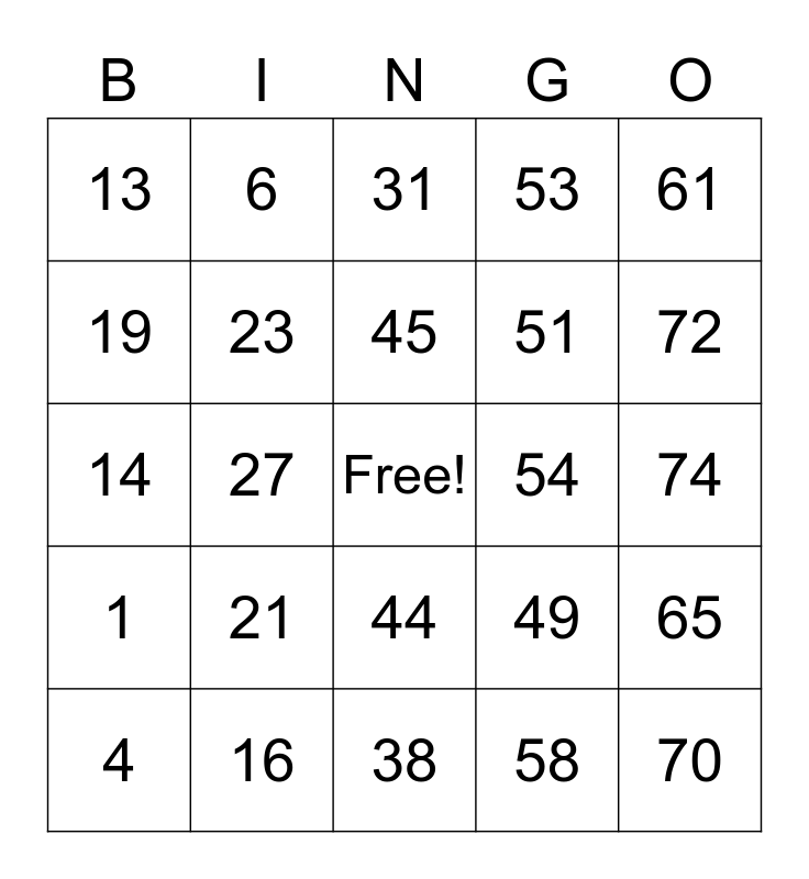 This bingo card has a free space and 29 words: 2, 16, 31, 47, 61, 13, 23, 45, 54, 65, 4, 27, 58, 70, 14, 18, 38, 49, 72, 1, 21, 41, 51, 74, 19, 6, 44, 53 and 72.