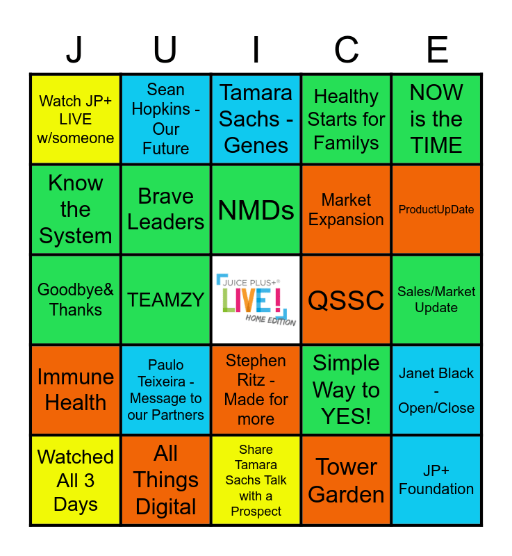 This bingo card has a free space and 24 words: Paulo Teixeira - Message to our Partners, All Things Digital, NMDs, Watched All 3 Days, NOW is the TIME, Watch JP+ LIVE w/someone, Know the System, Sean Hopkins - Our Future, QSSC, Stephen Ritz - Made for more, Market Expansion, Goodbye& Thanks, Simple Way to YES!, Janet Black - Open/Close, Brave Leaders, Tower Garden, Sales/Market Update, Tamara Sachs - Genes, ProductUpDate, TEAMZY, JP+ Foundation, Immune Health, Healthy Starts for Familys and Share Tamara Sachs Talk with a Prospect.