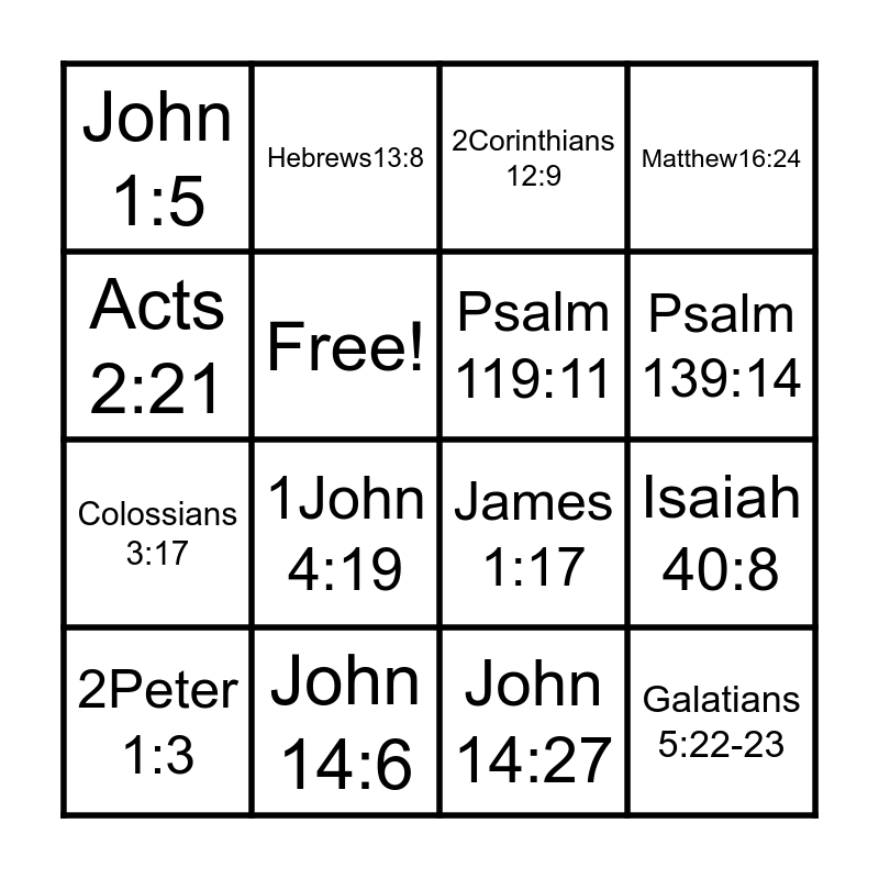 This bingo card has 20 words: Isaiah 40:8, Joshua 1:9, 2Corinthians 12:9, Proverbs 30:5, 2Peter 1:3, Acts 2:21, John 14:6, John 1:5, Colossians 3:17, Hebrews13:8, 1John 4:19, James 1:17, Free!, Galatians 5:22-23, Psalm 119:11, Jeremiah 29:11, Psalm 139:14, Matthew16:24, John 14:27 and Psalm 115:1.
