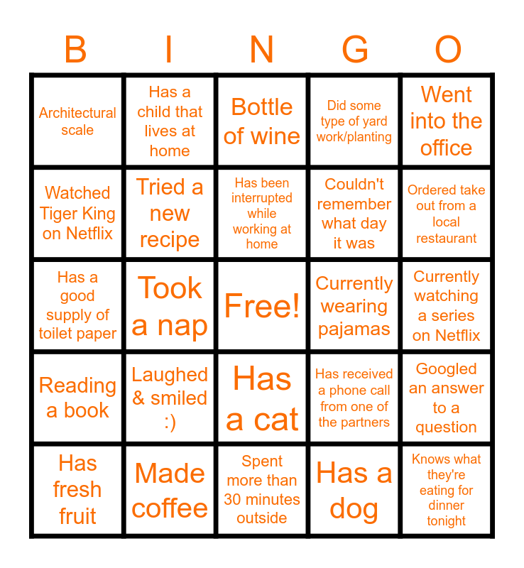This bingo card has a free space and 24 words: Laughed & smiled :), Made coffee, Has been interrupted while working at home, Has fresh fruit, Went into the office, Architectural scale, Watched Tiger King on Netflix, Has a child that lives at home, Currently wearing pajamas, Has a cat, Couldn't remember what day it was, Has a good supply of toilet paper, Has received a phone call from one of the partners, Googled an answer to a question, Tried a new recipe, Has a dog, Currently watching a series on Netflix, Bottle of wine, Ordered take out from a local restaurant, Took a nap, Knows what they're eating for dinner tonight, Reading a book, Did some type of yard work/planting and Spent more than 30 minutes outside.
