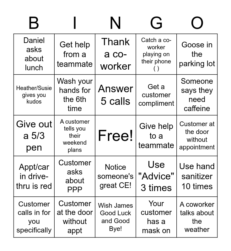 This bingo card has a free space and 24 words: Customer asks about PPP, Customer at the door without appt, Answer 5 calls, Customer calls in for you specifically, Goose in the parking lot, Daniel asks about lunch, Heather/Susie gives you kudos, Get help from a teammate, Give help to a teammate, Notice someone's great CE!, Get a customer compliment, Give out a 5/3 pen, Use "Advice" 3 times, Use hand sanitizer 10 times, Wash your hands for the 6th time, Your customer has a mask on, Customer at the door without appointment, Thank a co-worker, Someone says they need caffeine, A customer tells you their weekend plans, A coworker talks about the weather, Appt/car in drive-thru is red, Catch a co-worker playing on their phone ( ) and Wish James Good Luck and Good Bye!.