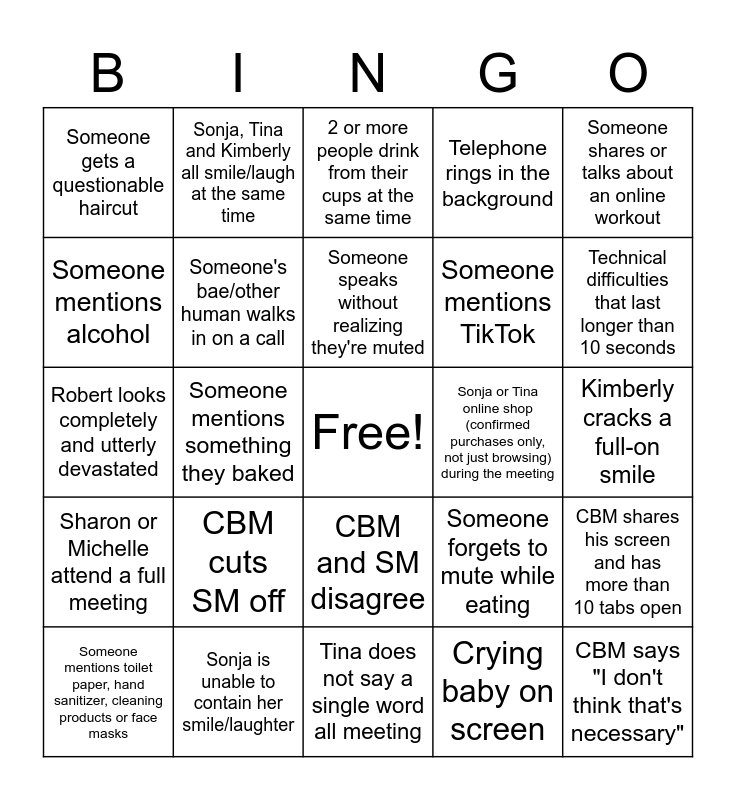 This bingo card has a free space and 24 words: CBM cuts SM off, Sonja is unable to contain her smile/laughter, Someone speaks without realizing they're muted, Someone mentions toilet paper, hand sanitizer, cleaning products or face masks, Someone shares or talks about an online workout, Someone gets a questionable haircut, Someone mentions alcohol, Sonja, Tina and Kimberly all smile/laugh at the same time, Sonja or Tina online shop (confirmed purchases only, not just browsing) during the meeting, CBM and SM disagree, Someone mentions TikTok, Robert looks completely and utterly devastated, Someone forgets to mute while eating, CBM shares his screen and has more than 10 tabs open, Someone's bae/other human walks in on a call, Crying baby on screen, Kimberly cracks a full-on smile, 2 or more people drink from their cups at the same time, Technical difficulties that last longer than 10 seconds, Someone mentions something they baked, CBM says "I don't think that's necessary", Sharon or Michelle attend a full meeting, Telephone rings in the background and Tina does not say a single word all meeting.
