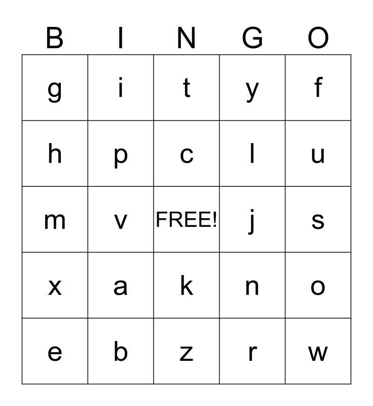 This bingo card has a free space and 24 words: a, b, c, e, f, g, h, i, j, k, l, m, n, o, p, r, s, t, u, v, w, x, y and z.