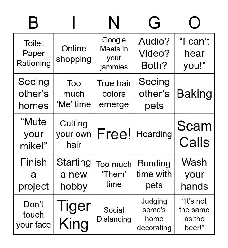 This bingo card has a free space and 30 words: Tiger King, Binge Watching Netflix, Cutting your own hair, Sleeping/waking at odd times, Toilet Paper Rationing, Google Meets in your jammies, Too much ‘Me’ time, Too much ‘Them’ time, Hoarding, Social Distancing, Scam Calls, “It’s not the same as the beer!”, Judging some's home decorating, Googling symptoms, Baking, Procrastination, Bonding time with pets, Finish a project, Starting a new hobby, “I can’t hear you!”, “Mute your mike!”, “Turn your camera off.”, Online shopping, Seeing other’s pets, Seeing other’s homes, Audio? Video? Both?, Wash your hands, Don’t touch your face, True hair colors emerge and Virtual EVERYTHING.