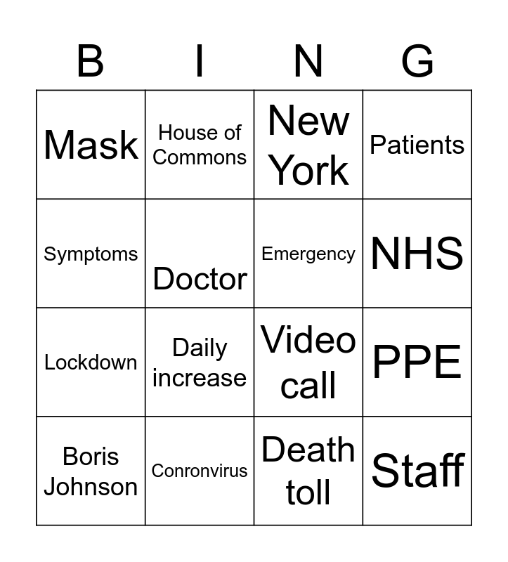 This bingo card has 16 words: Conronvirus, PPE, New York, Mask, Lockdown, House of Commons, Video call, Death toll, Symptoms, Doctor, Boris Johnson, Patients, Daily increase, NHS, Emergency and Staff.