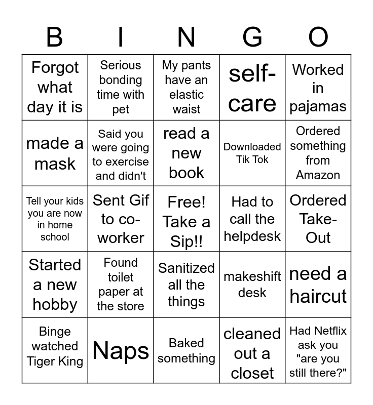 This bingo card has a free space and 29 words: Binge watched Tiger King, "Sorry. I was on Mute.", Sent Gif to co-worker, Had meeting interrupted by pet, Forgot what day it is, My pants have an elastic waist, Said you were going to exercise and didn't, Found toilet paper at the store, Had to call the helpdesk, Naps, Ordered Take-Out, Had Netflix ask you "are you still there?", Baked something, cleaned out a closet, Ordered something from Amazon, Had breakfast for dinner, Sanitized all the things, Started a new hobby, Worked in pajamas, Tell your kids you are now in home school, makeshift desk, Read a book, Downloaded Tik Tok, made a mask, self-care, Serious bonding time with pet, need a haircut, read a new book and took a walk.