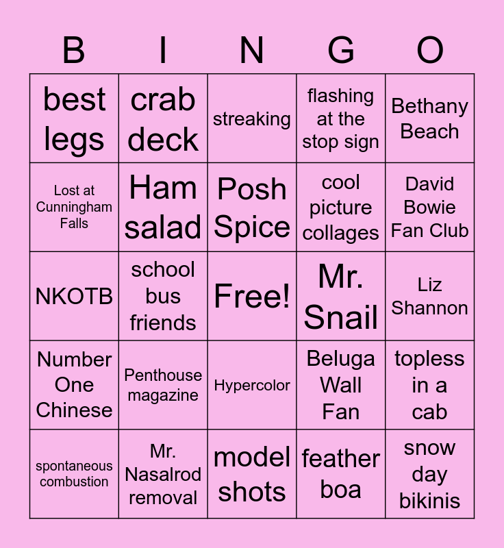 This bingo card has a free space and 34 words: taquitos an dales, feather boa, loves horses, Operation The Duck Flies at Midnight, Number One Chinese, Ham salad, Bethany Beach, spontaneous combustion, crab deck, I wannawatch... CryBaby, Posh Spice, streaking, Whitney, Casey-dillas, Mr. Snail, David Bowie Fan Club, Mr. Nasalrod removal, NKOTB, Penthouse magazine, Beluga Wall Fan, Hypercolor, Pink, best legs, Liz Shannon, model shots, snow day bikinis, flashing at the stop sign, Such a treat, cool picture collages, Lost at Cunningham Falls, midnight fries on the cruise, school bus friends, topless in a cab and Be respectful, responsible and have a great day..