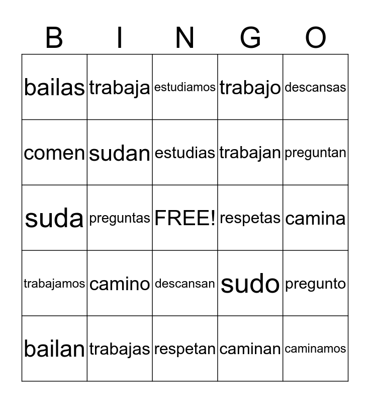 This bingo card has a free space and 24 words: camino, trabajas, estudias, bailan, descansas, bailas, comen, trabaja, respetas, descansan, trabajan, suda, sudo, pregunto, sudan, caminan, camina, estudiamos, preguntan, preguntas, caminamos, trabajamos, trabajo and respetan.