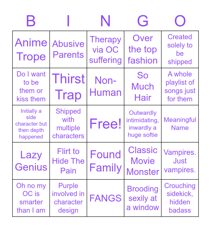 This bingo card has a free space and 24 words: Flirt to Hide The Pain, Purple involved in character design, Non-Human, Oh no my OC is smarter than I am, Created solely to be shipped, Anime Trope, Do I want to be them or kiss them, Abusive Parents, Outwardly intimidating, inwardly a huge softie, Found Family, So Much Hair, Initially a side character but then depth happened, Classic Movie Monster, Vampires. Just vampires., Thirst Trap, Brooding sexily at a window, Meaningful Name, Therapy via OC suffering, A whole playlist of songs just for them, Shipped with multiple characters, Crouching sidekick, hidden badass, Lazy Genius, Over the top fashion and FANGS.