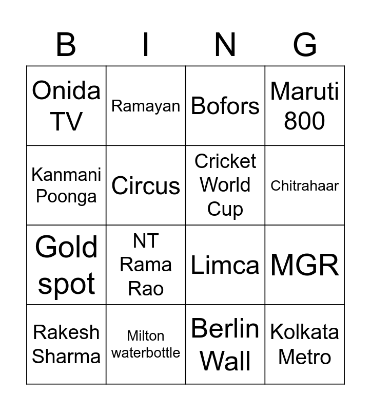 This bingo card has 25 words: Oliyum Oliyum, Camlin Geometry Box, Chitrahaar, The world this week, Kanmani Poonga, Onida TV, Circus, Ramayan, Milton waterbottle, Malgudi days, Gold spot, Limca, Free!, Indira Gandhi, Cricket World Cup, Chernobyl, Berlin Wall, Bofors, NT Rama Rao, MGR, Rakesh Sharma, My dear kutti chathan, Kolkata Metro, Maruti 800 and Ronald Reagan.