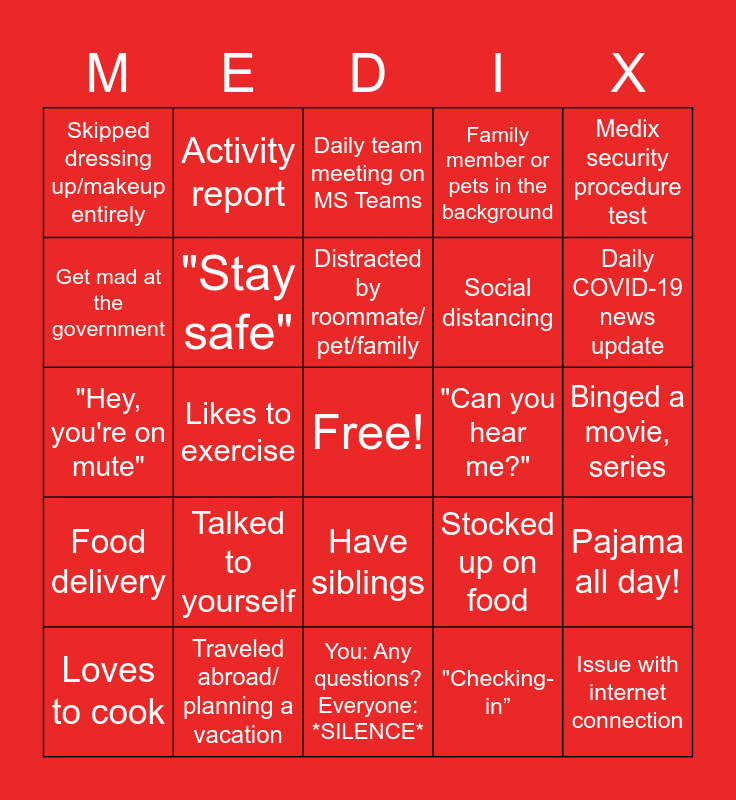 This bingo card has a free space and 31 words: Own pets, Traveled abroad/ planning a vacation, Distracted by roommate/ pet/family, Mask/Hand sanitizer hunting, Medix security procedure test, Skipped dressing up/makeup entirely, Likes to exercise, You: Any questions? Everyone: *SILENCE*, Social distancing, Issue with internet connection, Loves to cook, Talked to yourself, "Checking-in”, Speak 2 or more languages, Food delivery, Learned a new skill/hobby, Have siblings, "Can you hear me?", Binged a movie, series, "Sorry, I was on mute", Activity report, Wash hands once every hour for at least 30 seconds, Stocked up on food, Daily COVID-19 news update, "Hey, you're on mute", "Stay safe", Daily team meeting on MS Teams, Family member or pets in the background, Pajama all day!, Get mad at the government and Google COVID-19 symptoms.