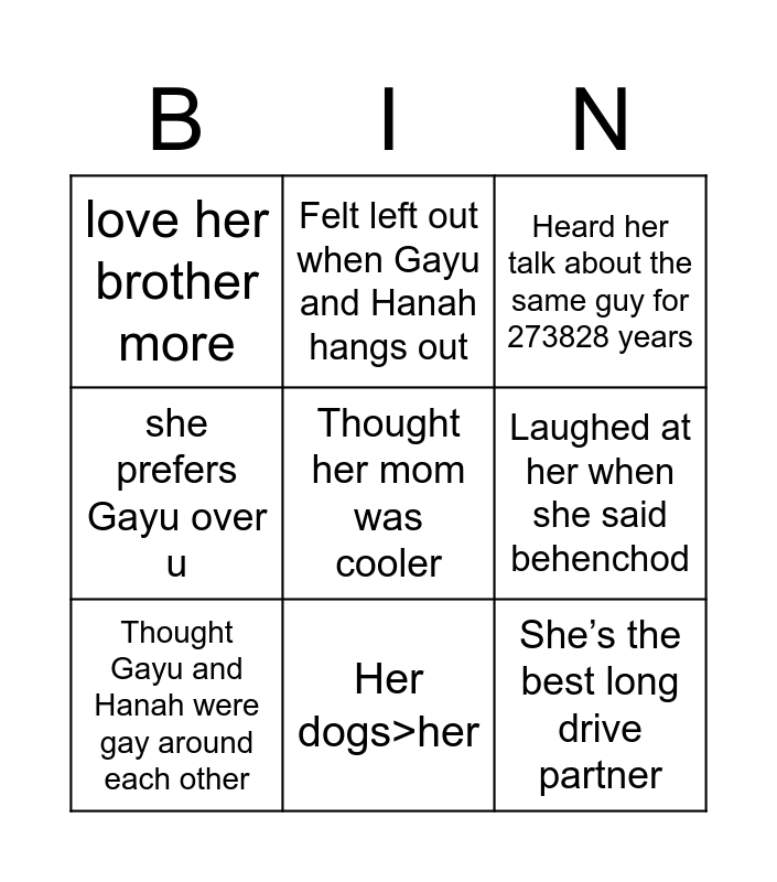 This bingo card has a free space and 8 words: Laughed at her when she said behenchod, Heard her talk about the same guy for 273828 years, Felt left out when Gayu and Hanah hangs out, Thought Gayu and Hanah were gay around each other, love her brother more, She’s the best long drive partner, she prefers Gayu over u and Her dogs>her.