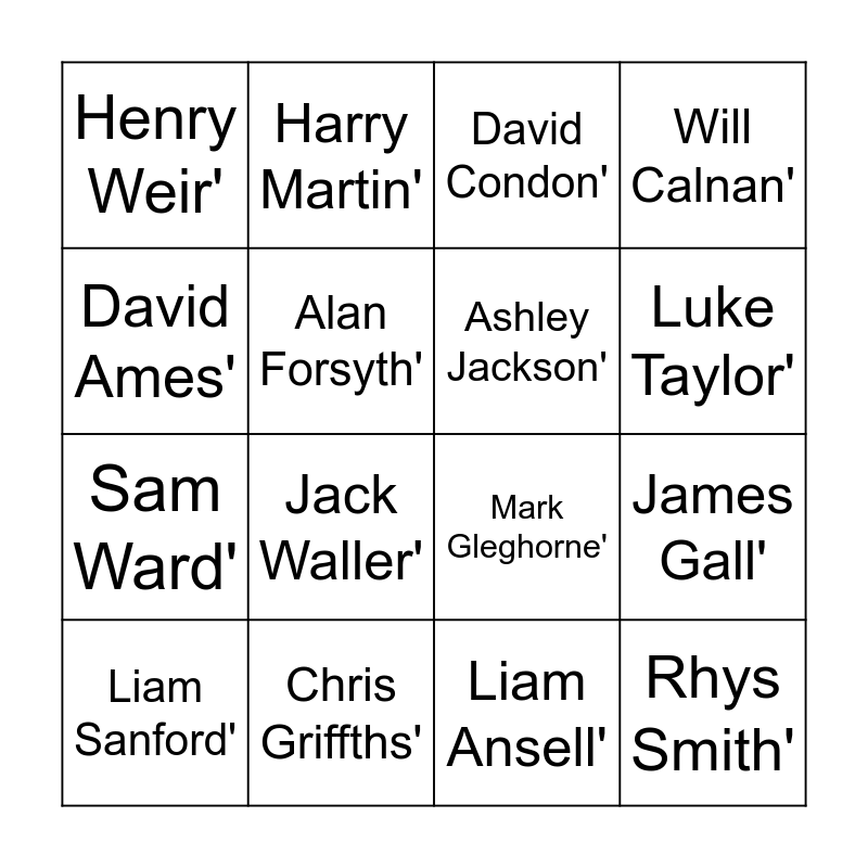 This bingo card has 25 words: George Pinner', Harry Gibson', Luke Taylor', Ollie Willars', David Ames', Henry Weir', Alan Forsyth', Harry Martin', Chris Griffths', Ian Sloan', Sam Ward', Mark Gleghorne', Phil Roper', Adam Dixon', Ashley Jackson', Brendan Creed', Liam Ansell', David Condon', Jack Waller', James Gall', Liam Sanford', Tom Sorsby', Rhys Smith', Will Calnan' and Zach Wallace'.