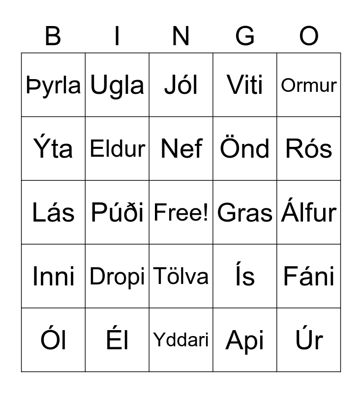 This bingo card has a free space and 32 words: Api, Haf, Púði, Bátur, Inni, Eldur, Ormur, Fáni, Ugla, Kaka, Nef, Jól, Sofa, Bað, Gras, Mús, Ól, Lás, Tölva, Dropi, Ís, Ær, Álfur, Él, Úr, Viti, Önd, Ýta, Þyrla, Yddari, Kex and Rós.