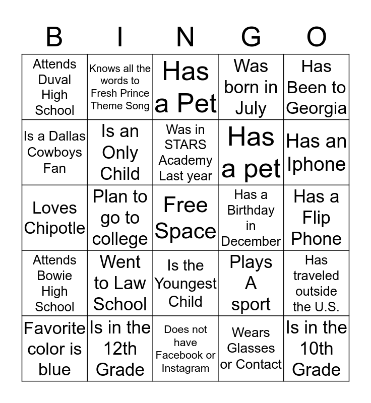 This bingo card has a free space and 24 words: Went to Law School, Is in the 12th Grade, Was in STARS Academy Last year, Favorite color is blue, Has Been to Georgia, Attends Duval High School, Is a Dallas Cowboys Fan, Knows all the words to Fresh Prince Theme Song, Has a Birthday in December, Is the Youngest Child, Has a pet, Loves Chipotle, Plays A sport, Has traveled outside the U.S., Is an Only Child, Wears Glasses or Contact, Has a Flip Phone, Has a Pet, Has an Iphone, Plan to go to college, Is in the 10th Grade, Attends Bowie High School, Was born in July and Does not have Facebook or Instagram.