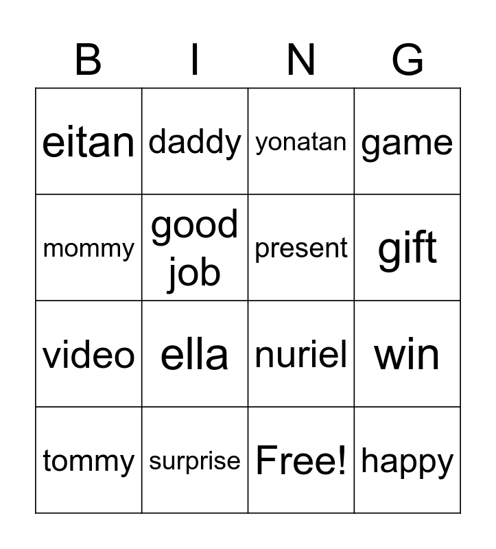 This bingo card has 17 words: Free!, tommy, yonatan, eitan, ella, game, win, present, gift, good job, surprise, nuriel, mommy, daddy, video, fun and happy.