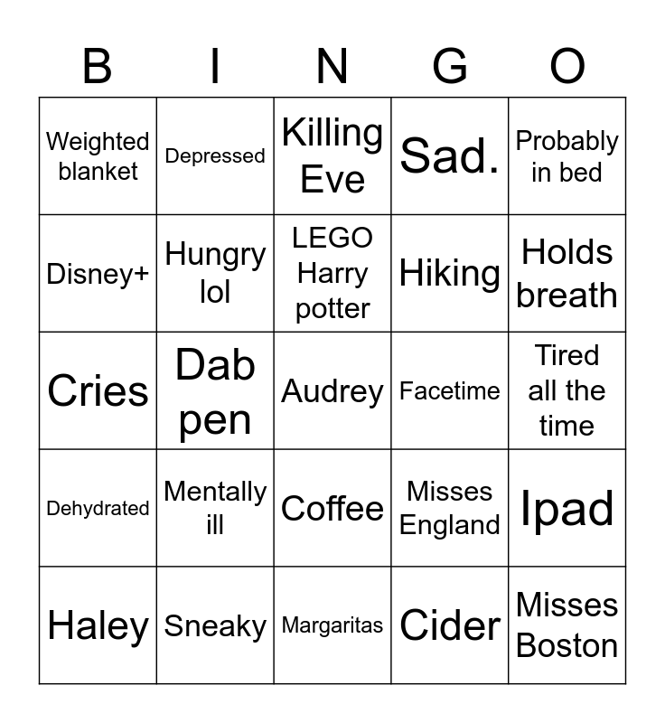 This bingo card has a free space and 24 words: Mentally ill, Sneaky, LEGO Harry potter, Haley, Probably in bed, Weighted blanket, Disney+, Depressed, Facetime, Coffee, Hiking, Cries, Misses England, Ipad, Hungry lol, Cider, Tired all the time, Killing Eve, Holds breath, Dab pen, Misses Boston, Dehydrated, Sad. and Margaritas.