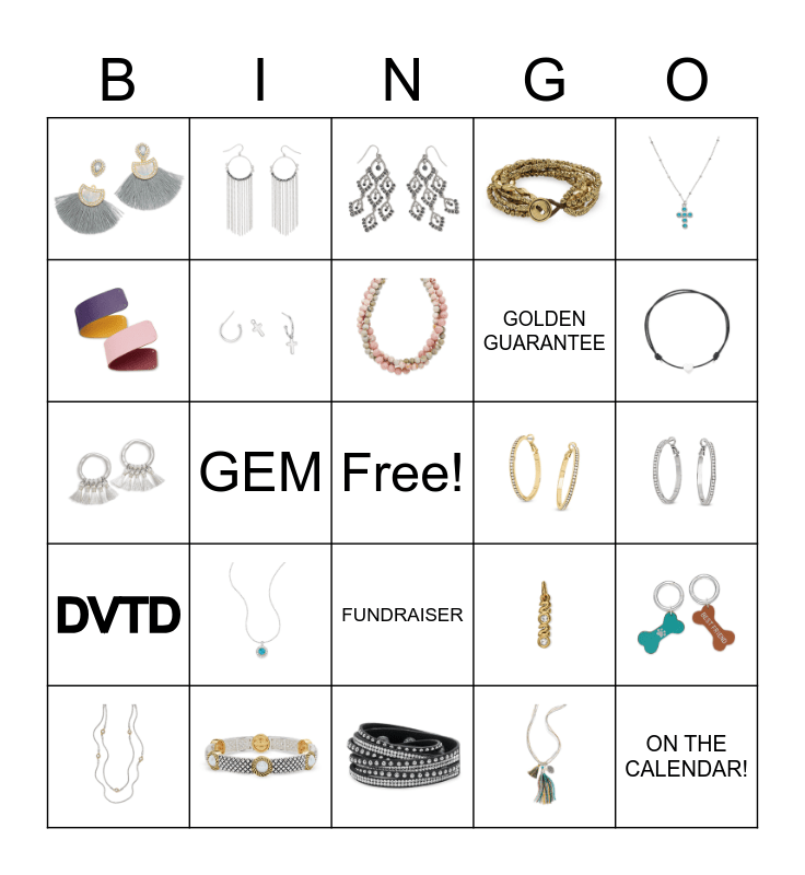 This bingo card has 19 images, a free space and 5 words: DVTD, GEM, FUNDRAISER, GOLDEN GUARANTEE and ON THE CALENDAR!.
