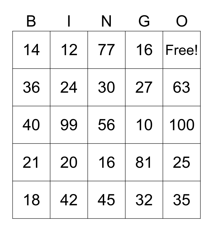 This bingo card has a free space and 24 words: 20, 42, 30, 18, Free!, 14, 36, 12, 10, 16, 27, 40, 81, 25, 24, 32, 100, 77, 63, 99, 35, 21, 16 and 45.