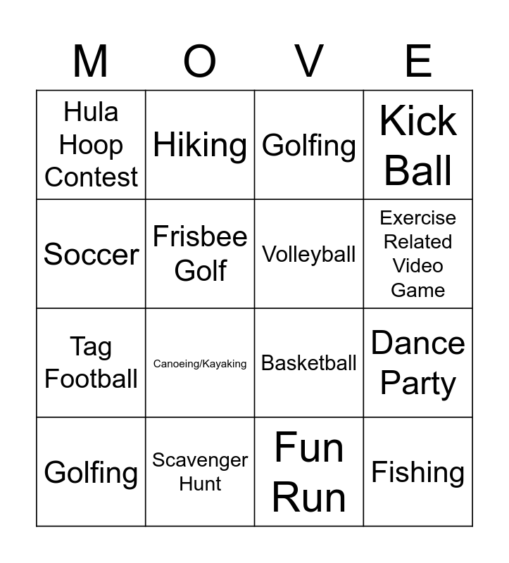This bingo card has 16 words: Scavenger Hunt, Dance Party, Golfing, Hula Hoop Contest, Tag Football, Hiking, Basketball, Fun Run, Soccer, Frisbee Golf, Golfing, Kick Ball, Canoeing/Kayaking, Exercise Related Video Game, Volleyball and Fishing.