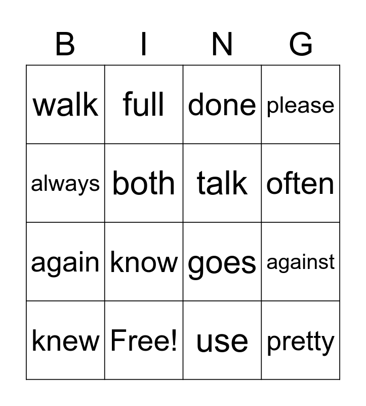 This bingo card has 22 words: Free!, shall, full, pull, both, talk, walk, done, goes, pretty, again, please, animal, sure, use, used, against, knew, know, always, often and once.