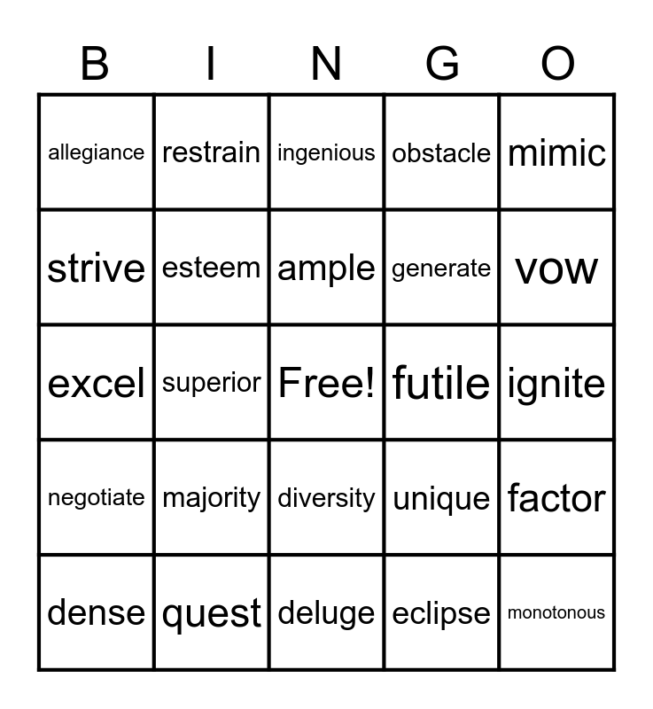 This bingo card has a free space and 63 words: anguish, continuous, erupt, factor, intimidate, maximum, restrain, unanimous, ample, collaborate, diversity, dominate, ignite, mimic, rural, strive, superior, allegiance, chronological, generate, majority, negotiate, obstacle, prejudice, remote, transform, collide, consequence, drastic, loathe, provoke, retaliate, sanctuary, treacherous, vow, dense, deplete, eclipse, eerie, esteem, excel, futile, hazardous, influence, monotonous, quest, solar, unique, anticipate, apparel, controversy, deluge, designate, equivalent, hostile, ingenious, jovial, makeshift, salvage, significant, terrain, unruly and vacate.