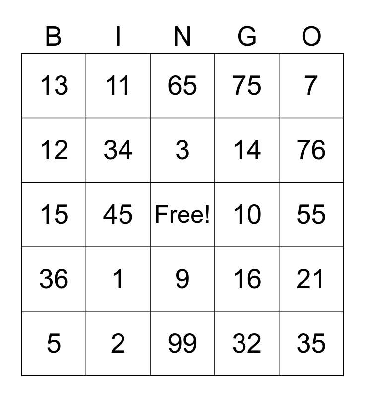 This bingo card has a free space and 24 words: 1, 2, 3, 5, 7, 13, 12, 11, 10, 9, 14, 15, 16, 21, 34, 32, 55, 65, 76, 45, 35, 36, 75 and 99.