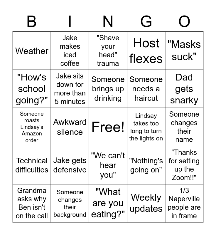 This bingo card has a free space and 24 words: Jake gets defensive, Someone changes their background, Someone brings up drinking, Grandma asks why Ben isn't on the call, "Masks suck", Weather, "How's school going?", Jake makes iced coffee, Lindsay takes too long to turn the lights on, "We can't hear you", Someone needs a haircut, Someone roasts Lindsay's Amazon order, "Nothing's going on", "Thanks for setting up the Zoom!!", Jake sits down for more than 5 minutes, Weekly updates, Someone changes their name, "Shave your head" trauma, Dad gets snarky, Awkward silence, 1/3 Naperville people are in frame, Technical difficulties, Host flexes and "What are you eating?".