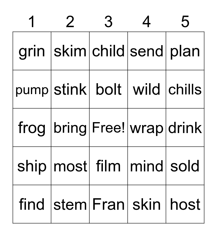 This bingo card has a free space and 24 words: most, stem, bolt, find, plan, grin, pump, skim, wrap, film, wild, frog, mind, sold, stink, skin, drink, child, chills, bring, host, ship, send and Fran.